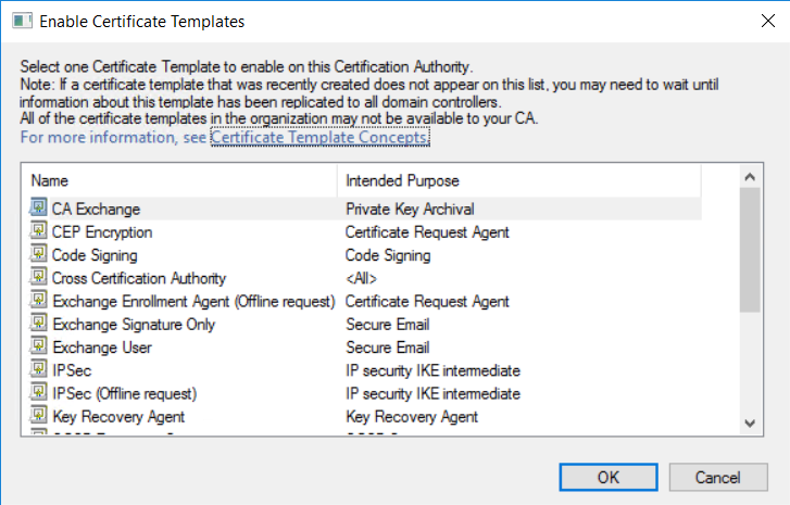 Right-click Certificate Templates, and then select New > Certificate Template to issue. The Enable Certificates Template dialog box appears.