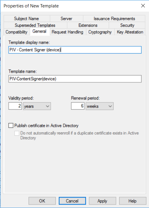 Scroll the template list, right-click the PIV - PIV Authentication template and select Duplicate Template. The Properties of New Template dialog box appears.