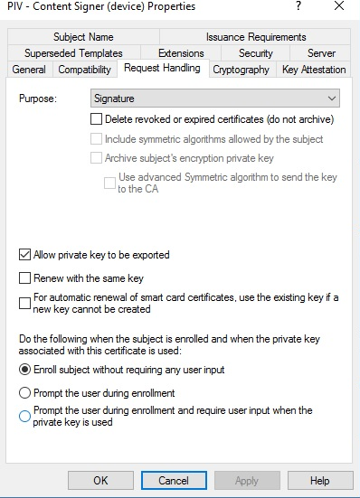 Select Enroll subject without requiring any user input under "Do the following when the subject is enrolled and when the private key associated with this certificate is used."