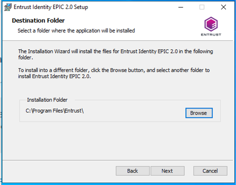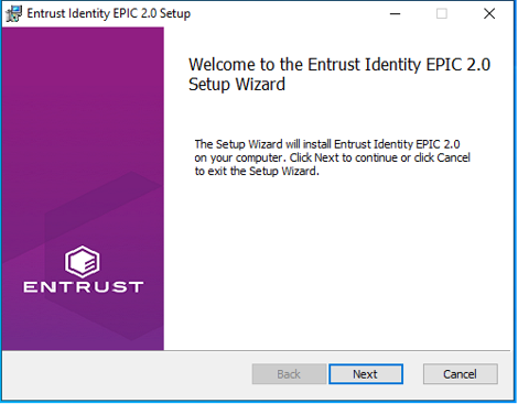 Double-click the Entrust Identity EPIC 2.0.msi installer file. The Entrust Identity Epic 2.0 Setup Wizard appears.