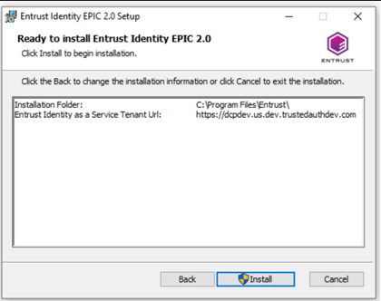 Click Next. The Ready to Install Entrust Identity EPIC 2.0 page appears.